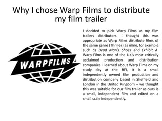I decided to have Warp Films distribute my film trailer because Warp Films distributes similar thriller genre films and is a small, independent UK production and distribution company like my own small, independent film. I learned about Warp Films from an A-Level study day at the BFI. Warp Films has a distinct brand identity as a Northern English company that gives artists creative freedom and profit participation. They distribute "artist-driven content" aimed at the middle ground between arthouse and complex films.