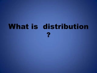 Distribution is the competitive business of launching films in theaters and other markets to maximize their commercial success. Distributors obtain films from producers, studios, or through output deals, then develop tailored release plans considering the target audience and film's earnings potential. Their goal is to bring each film to market from scratch through effective marketing like posters, trailers, and word of mouth to build demand and realize the film's box office potential.