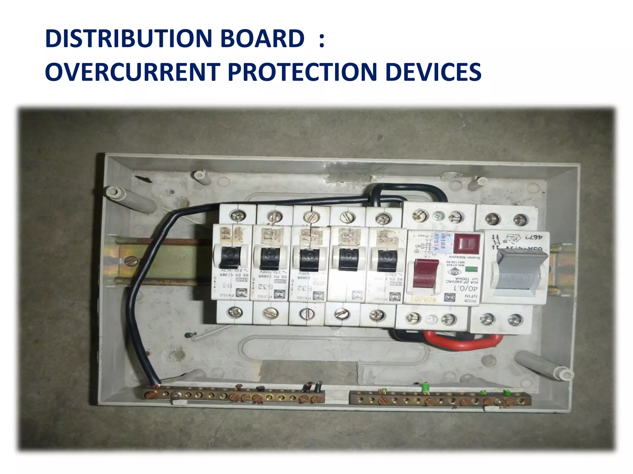 This document discusses distribution boards and overcurrent protection devices. It provides information on:
