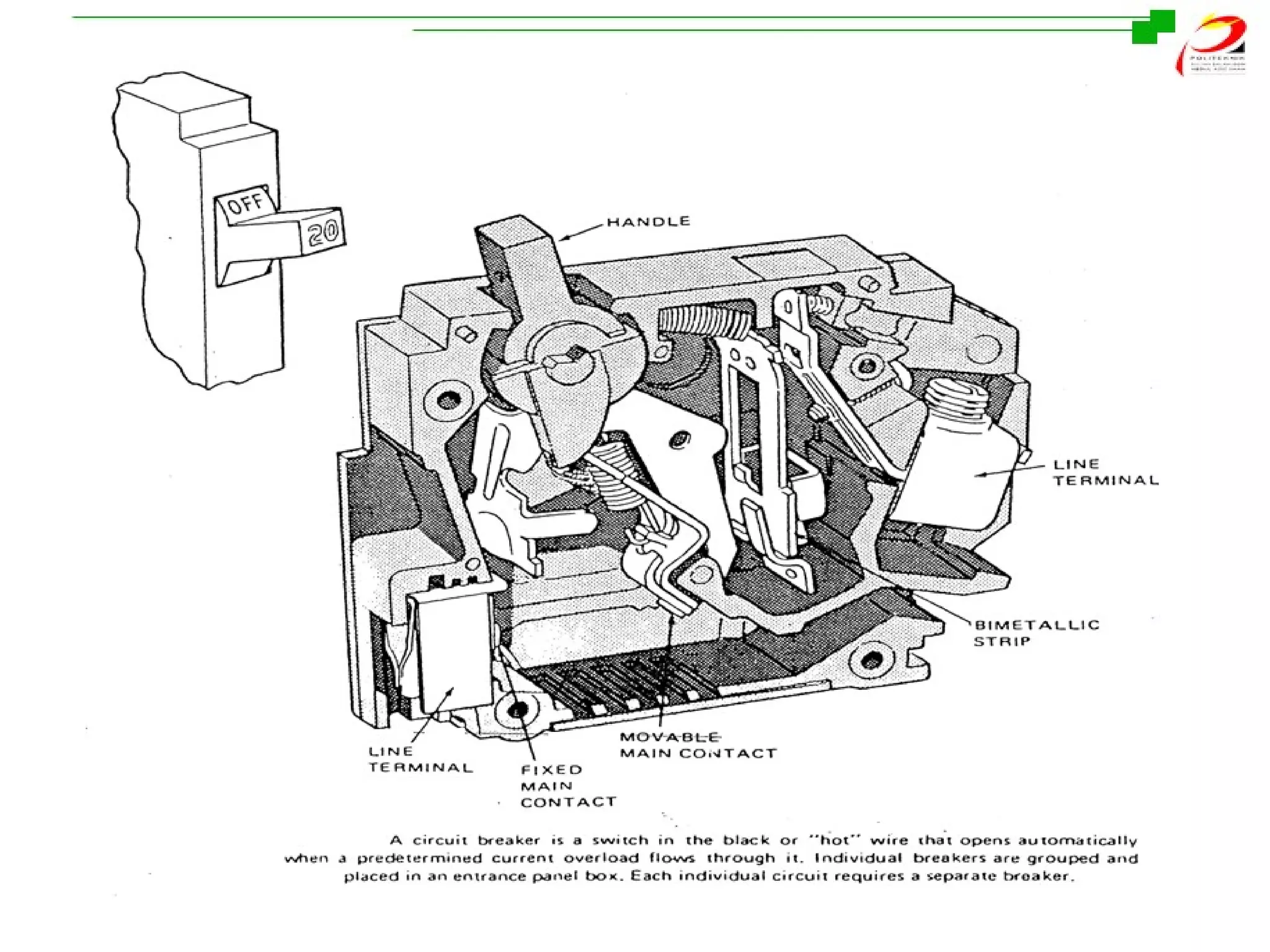 - Miniature circuit breakers (MCBs) of various amp sizes for protection of single phase 240V circuits, which operate through either magnetic or thermal mechanisms.