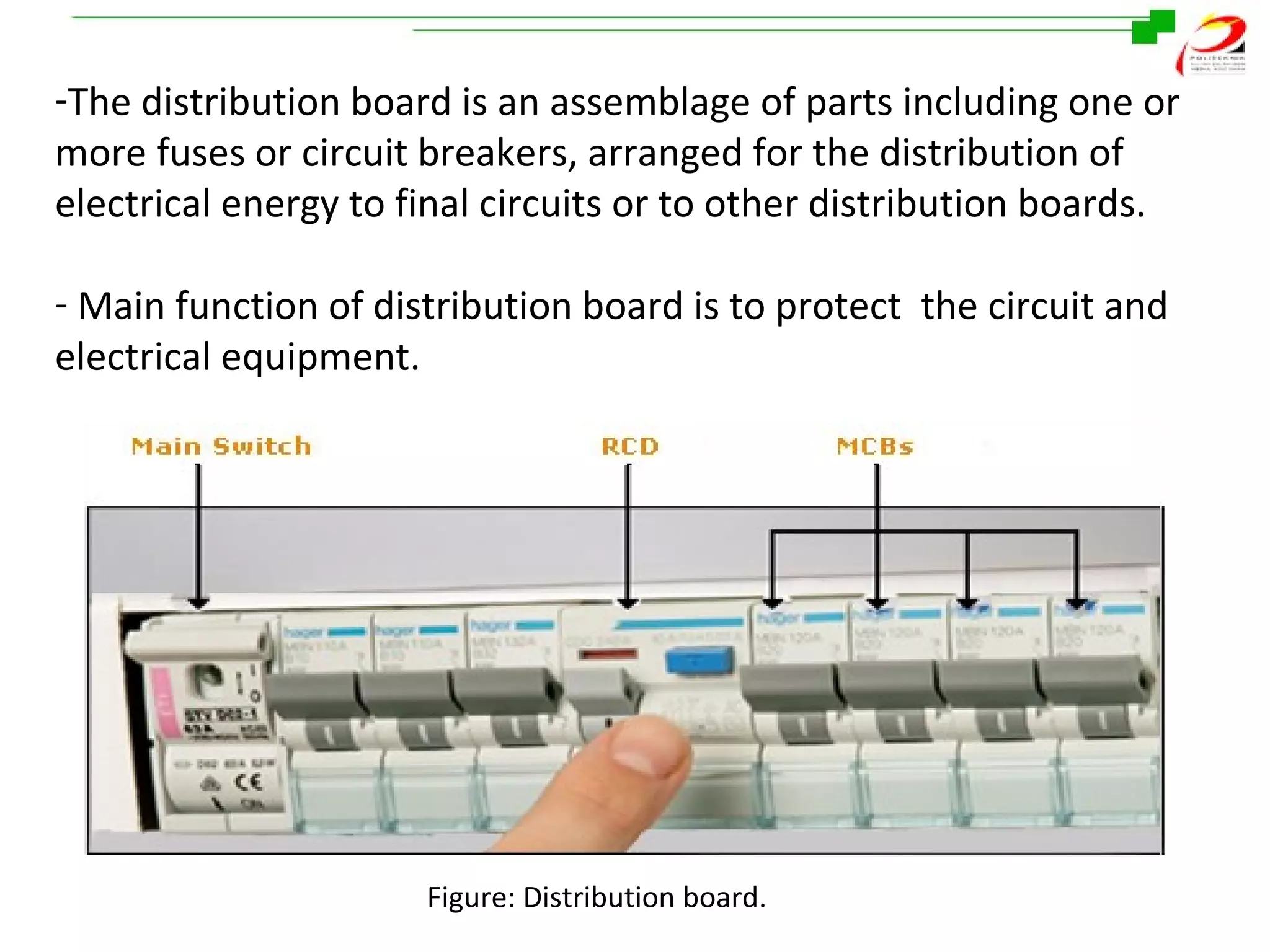 - The main components and functions of a distribution board, including circuit breakers and fuses for distributing electrical energy.