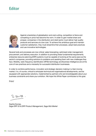 In a competitive market where companies must deliver high quality at low cost, distribution businesses face challenges around optimizing inventory, managing tight margins, and providing excellent customer service across multiple sites. To address these challenges, companies must streamline key processes like sales forecasting, procurement, order management, and logistics/delivery. Emerging technologies like business intelligence, RFID, and mobility are also critical to enable real-time visibility, traceability, and flexible workforce productivity needed to succeed in this fast-moving market.
