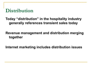 This document discusses distribution channels in the hospitality industry. It begins by defining distribution and describing how it relates to the marketing mix elements of place and price. It then discusses how distribution has evolved with revenue management and internet marketing. It describes different types of distribution channels and intermediaries involved in getting customers to products. It discusses challenges like costs, technology changes, and managing diverse inventory. The goal is to optimize revenue through selling the right product to customers using the right distribution channel.