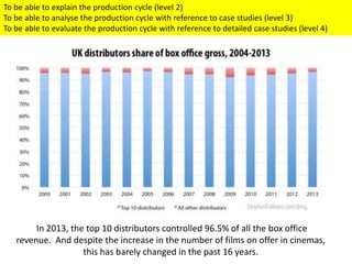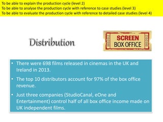 The document discusses film distribution in the UK in 2013. It states that 698 films were released in cinemas that year. The top 10 distributors accounted for 97% of box office revenue. Three companies (StudioCanal, eOne and Entertainment) controlled half of box office income from UK independent films.