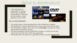 This document discusses film distribution and describes Lionsgate and Paramount as potential distributors. It summarizes that Lionsgate would be the best choice to distribute a paranormal thriller film about a haunting because Lionsgate specializes in similar genres and targets the desired audience. While Paramount is a major distributor, it focuses more on blockbusters than thrillers. Social media, especially Instagram and Facebook, are identified as effective ways to market the film to its young target audience.