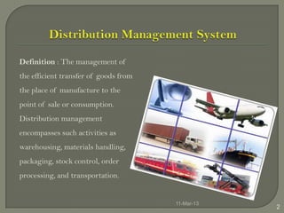 This document provides an overview of distribution management. It defines distribution management as the efficient transfer of goods from the place of manufacture to the point of sale or consumption. It then lists the names, organizations, and positions of 7 team members presenting on distribution management systems. The presentation goes on to discuss key distribution concepts like product, place, price, and promotion. It also describes different distribution channels including direct selling, indirect selling through wholesalers and retailers, and different distribution intensities. The document concludes with an overview of channel formats like producer-driven, seller-driven, and service-driven distribution.