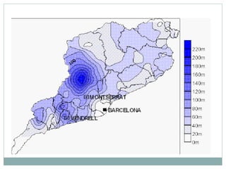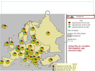 This document discusses different types of distribution maps, including dot maps, choropleth maps, proportional circle maps, and isoline maps. Dot maps represent values using dots, with dot density corresponding to measurement levels. Choropleth maps use color shades to show measurement variations across areas. Proportional circle maps represent data at points using circle areas scaled to values. Isoline maps show quantities that vary smoothly using lines or colors of equal value. Each map type has advantages like ease of use but also disadvantages like difficulty showing some relationships.