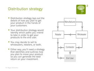A distribution strategy identifies how a company will get its products to customers through various distribution channels. The strategy involves 5 steps: 1) Evaluate end-users, 2) Identify potential intermediaries like agents, wholesalers, retailers, and resellers, 3) Research intermediaries, 4) Select the most profitable channels like intensive, selective, or exclusive distribution, and 5) Manage channels to maximize return on investment. The distribution strategy outlines the details of moving products efficiently to generate the best financial returns.