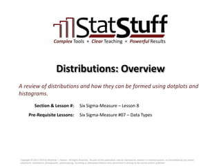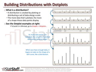 This document discusses distributions and how they can be formed and visualized using dotplots and histograms. It defines what a distribution is, how dotplots and histograms work to plot data values, and how the shape of distributions is influenced by their central tendency and variation. Key aspects covered include how histograms are better for displaying larger continuous data sets than dotplots by grouping values into bins, and how the kurtosis of a distribution indicates the shape of its peak near the mean value. The document provides examples and instructs readers to create and analyze dotplots and histograms of sample metric data.