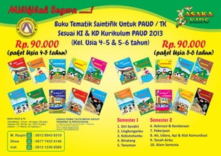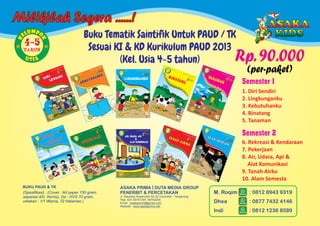Dokumen ini menawarkan buku tematik saintifik untuk PAUD/TK sesuai kurikulum 2013 dengan harga Rp. 90.000 per paket untuk kelompok usia 4-5 tahun dan 5-6 tahun. Buku ini mencakup topik-topik penting seperti diri sendiri, lingkungan, dan alam semesta dalam spesifikasi cetakan berwarna 32 halaman. Kontak dan informasi penerbit Asaka Prima Duta Media Group juga dicantumkan.