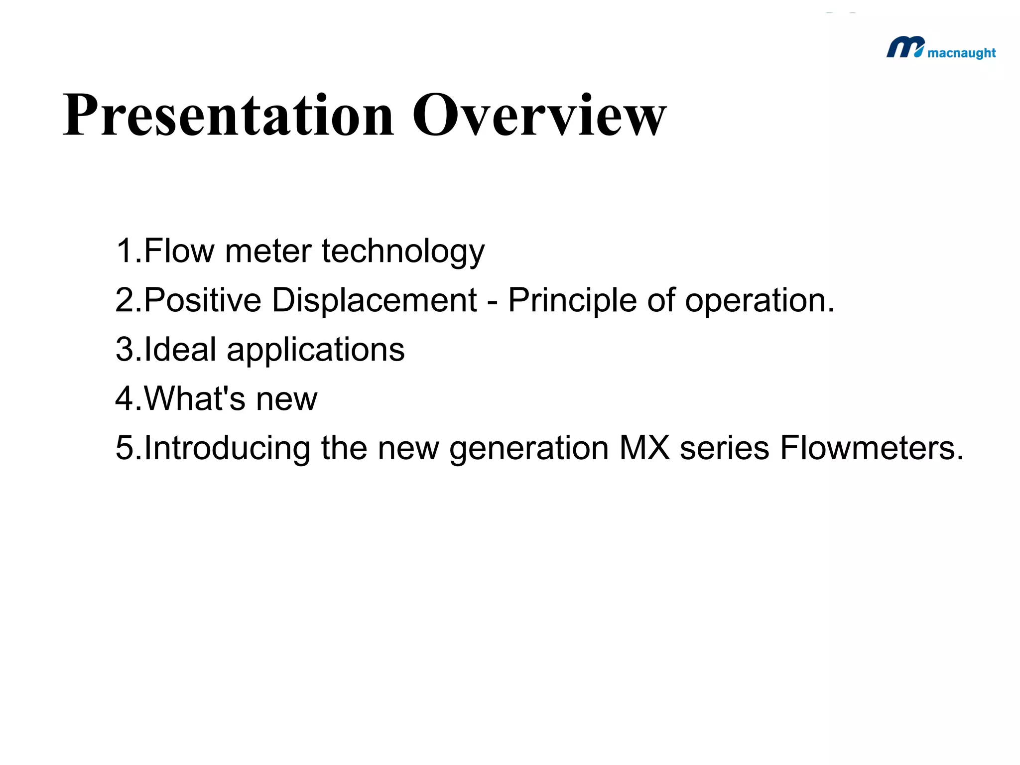 The document provides an overview of flow meter technologies, with a focus on positive displacement flow meters. It discusses the principles of operation for positive displacement meters, including how they directly measure volume by passing measured volumes of fluid through a measuring chamber. The document also outlines applications for positive displacement meters like batching and dispensing. It introduces the new MX series of positive displacement flow meters from Macnaught, highlighting features like increased temperature and pressure ratings, a new mounting system, and hazardous area approvals.