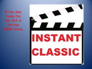District 9 is a sci-fi film directed by Neill Blomkamp that depicts aliens living in shanty towns among humans in South Africa. The film received critical acclaim and was praised for subverting typical alien invasion tropes. It portrays the South African government initially helping the aliens but later hiding things and creating conspiracy theories. The main character starts as unlikable but gains sympathy from the audience as he takes the aliens' side against government oppression.