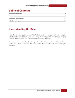 The survey report summarizes the results of a student opinion survey given to 1,421 students in grades 2-12 in the Scottsbluff Public Schools district. Key findings include: