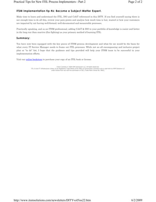 This two-part document provides tips for implementing ITIL processes. Part 1 discussed training process leaders, adopting rather than just implementing ITIL, using documentation, and implementing in phases. Part 2 recommends shaping processes using ISO/IEC 20000 as a guide, drawing process flow diagrams, and ensuring processes meet ISO, ITIL, and COBIT standards. It emphasizes becoming an expert in these frameworks to define well-formed and measurable IT processes.