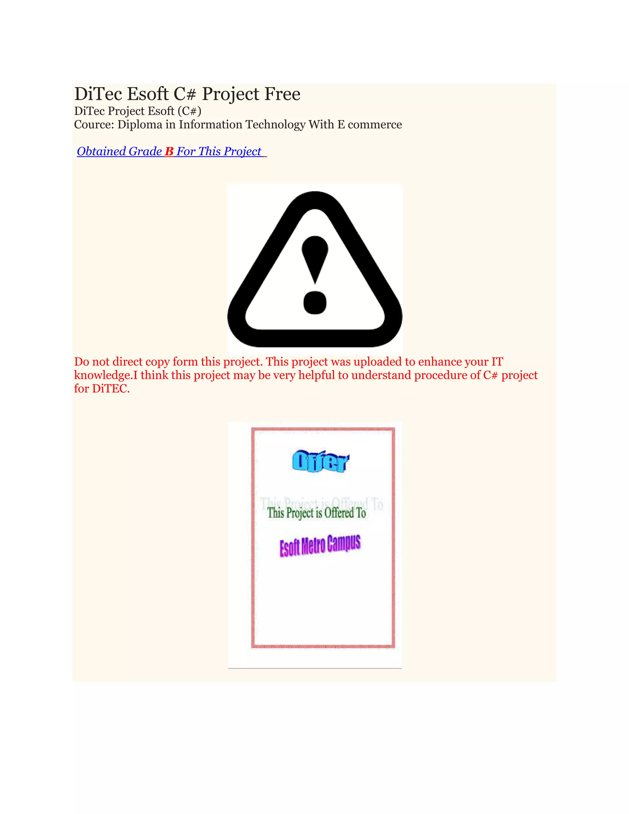 The document outlines a C# project for a hospital management system created as part of a diploma in information technology with e-commerce, earning a grade of B. It details various functionalities like user authentication, data entry, updates, and deletion for patient, medical, and doctor details using a database connection. The code snippets provide a comprehensive look into the logic behind user interaction and data management for the application.