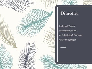 1. Diuretics promote urine production and can treat conditions like heart failure, kidney issues, hypertension, and liver cirrhosis. They work by either increasing glomerular filtration or decreasing tubular reabsorption of water and ions in the kidneys.