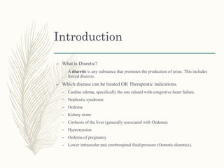 This document provides information on diuretics, including what they are, the conditions they can treat, their mechanisms of action, and classifications. The main points are: