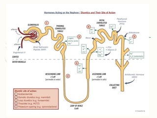 2. Diuretics can be classified as mercurial or non-mercurial. Common non-mercurial classes include thiazides, carbonic anhydrase inhibitors, and loop diuretics which act at different parts of the nephron.