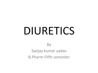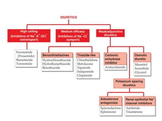 This document discusses different classes of diuretic drugs, including their mechanisms of action and therapeutic uses. It covers carbonic anhydrase inhibitors, loop diuretics, thiazide diuretics, potassium-sparing diuretics like spironolactone, and osmotic diuretics like mannitol. The main points are: