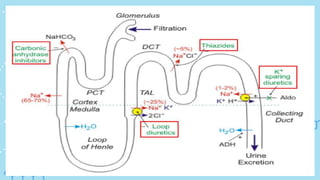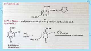 This document provides an overview of diuretics, which are drugs that increase urine production by the kidneys, and are used to treat conditions like hypertension and fluid retention. It covers various classes of diuretics, including carbonic anhydrase inhibitors, thiazides, potassium-sparing diuretics, and loop diuretics, detailing their mechanisms, uses, properties, and specific examples. Each diuretic class is discussed with information on common medications, formulations, dosage, and storage recommendations.