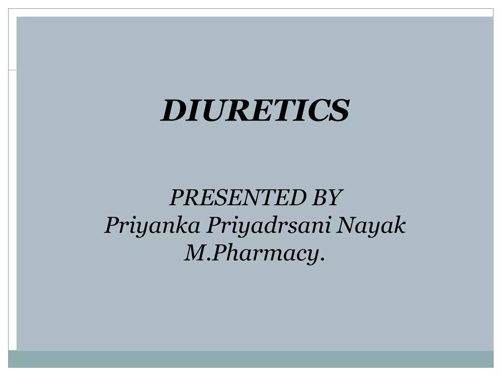 1. Diuretics are drugs that cause increased excretion of water and sodium in urine. They are classified based on their mechanism and efficacy as high ceiling loop diuretics, medium efficacy thiazides, weak carbonic anhydrase inhibitors, and potassium-sparing diuretics.