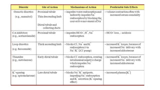 The document discusses the use of diuretics in various kidney diseases, including their pharmacology, clinical applications, and challenges such as diuretic resistance. It outlines different classes of diuretics, their mechanisms, and the importance of dosage adjustments based on patient conditions such as hypoalbuminemia and acute kidney injury (AKI). The conclusion emphasizes that while diuretics can be beneficial, their use needs careful evaluation in chronic kidney disease and AKI to avoid adverse outcomes.