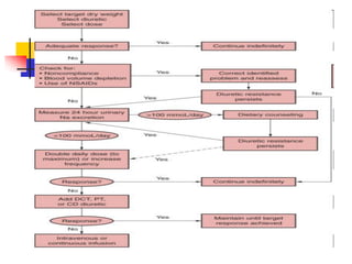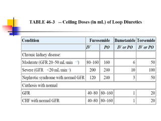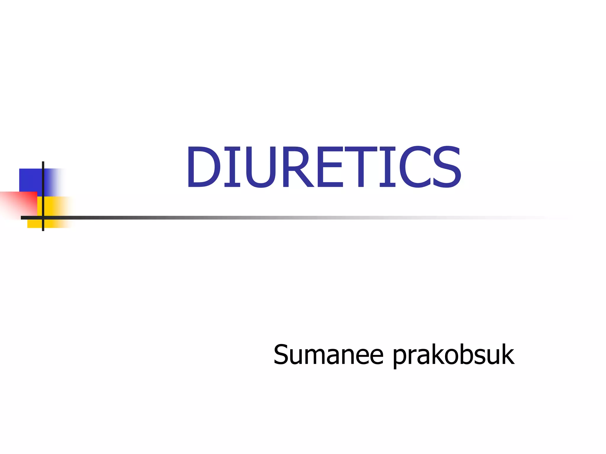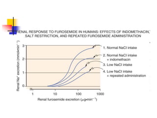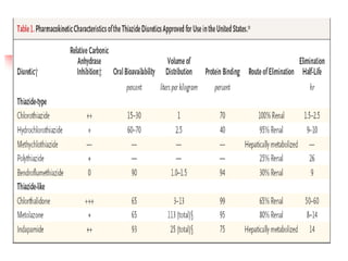 Loop diuretics, thiazides, and other diuretic classes are summarized. Loop diuretics act in the thick ascending limb of Henle's loop by inhibiting the Na-K-2Cl transporter. Thiazides act in the distal convoluted tubule by blocking coupled Na and Cl reabsorption. Carbonic anhydrase inhibitors inhibit bicarbonate absorption in the proximal tubule. Osmotic diuretics like mannitol are filtered but not reabsorbed, drawing water out of cells. Potassium-sparing diuretics like amiloride act late in the distal nephron to inhibit Na reabsorption. Diuretic combinations can have synergistic effects.