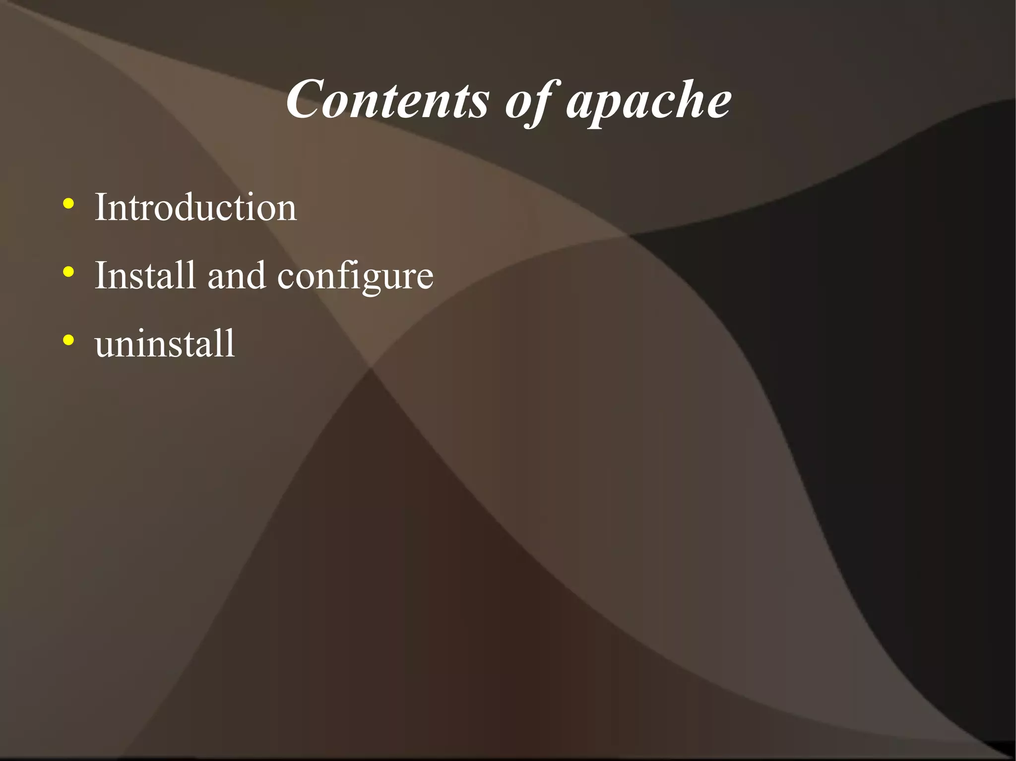 Apache is an open-source web server that is widely used due to its features, performance, and availability for free. The document provides instructions on how to install, configure, customize, and uninstall Apache on a Linux system. It describes downloading and extracting the Apache files, running the configuration script, editing the configuration file, starting the server, and testing it in a web browser. It also lists some common Apache modules and provides steps to stop and uninstall Apache if it is no longer needed.