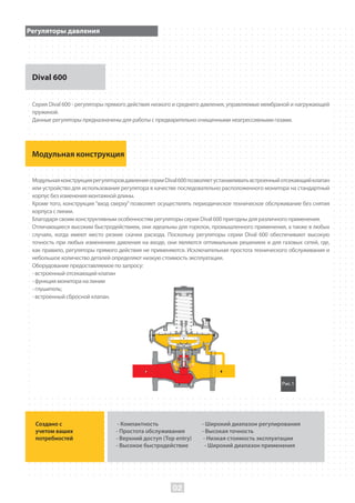 Регуляторы давления серии Dival 600 предназначены для работы с неагрессивными газами и обладают модульной конструкцией, обеспечивающей высокую точность и простоту обслуживания. Они подходят для применения в различных областях, включая газовые сети и горелки, и могут быть дополнены встроенными устройствами, такими как отсекатели и глушители. Основные характеристики включают диапазон выходного давления от 12 мбар до 4200 мбар и конструкцию, позволяющую легкую установку и техническое обслуживание.
