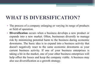 Diversification is the process of expanding a company's range of products or fields of operation in order to manage risk. It allows companies to offset losses from underperforming business lines. The main advantages are reducing risk, increasing financial gains, market share, and growth. However, diversification can also lead to overextension, lack of expertise in new areas, and increased costs if not approached carefully. Companies diversify their business in either related or unrelated ways. Some examples of companies that have successfully diversified are provided.