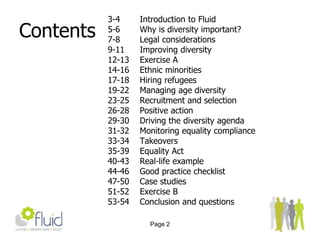 The document outlines the importance of diversity in the workplace, emphasizing its benefits such as increased innovation and a broader customer base. It discusses legal considerations, strategies for improving diversity, and best practices for recruitment and age management, along with real-life examples and case studies. The content is structured to provide guidance on fostering an inclusive environment while ensuring compliance with evolving legal frameworks like the Equality Act.