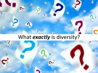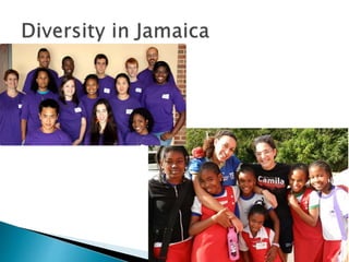 This document discusses diversity in the Jamaican classroom. It begins by defining diversity as understanding and respecting individual differences. It then identifies some diversities in Jamaican society such as gender, social class, religions and geographical location. Some diversities in the Jamaican classroom are also identified, including racial, cultural, sexual, gender and students with exceptionalities. The document examines attitudes towards diversity that can impact the classroom, such as prejudices and stereotyping. Finally, it provides strategies for managing diversity in the classroom, which include identifying one's own attitudes, establishing a comfortable environment, getting to know students, and treating all students equally.