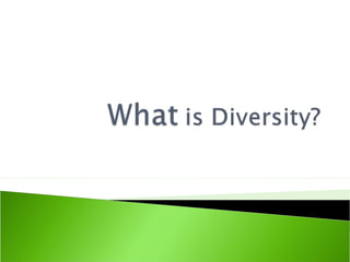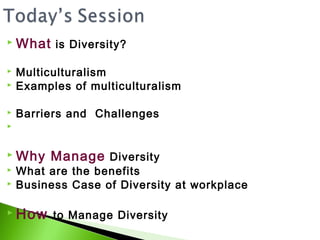 This document discusses diversity and managing diversity in the workplace. It begins by defining diversity and providing examples of diverse attributes such as age, gender, religion, and disability. It then addresses challenges of diversity like biases, barriers, and stereotyping. The document emphasizes that managing diversity creates business benefits such as access to a wider talent pool, better decision-making, and improved productivity and morale. It provides tips for effective diversity management, including promoting awareness, fostering open communication, implementing fair policies, and ongoing diversity training. The overall message is that a diverse and inclusive workforce reflects the changing world and strengthens an organization.