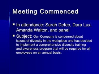 The document discusses a meeting focused on implementing a comprehensive diversity training and awareness program for all employees annually. It covers topics such as the legal implications of diversity, potential competitive advantages, and the costs and logistics of training. The discussion also includes concerns regarding the organization’s image and the effectiveness of the diversity initiatives.