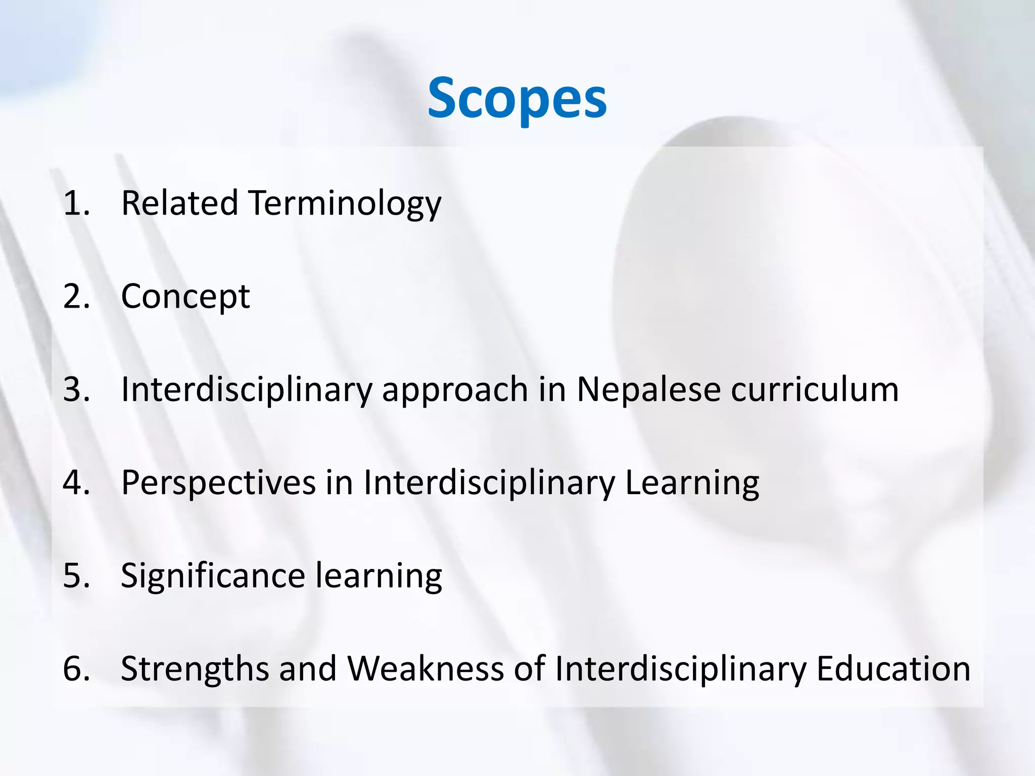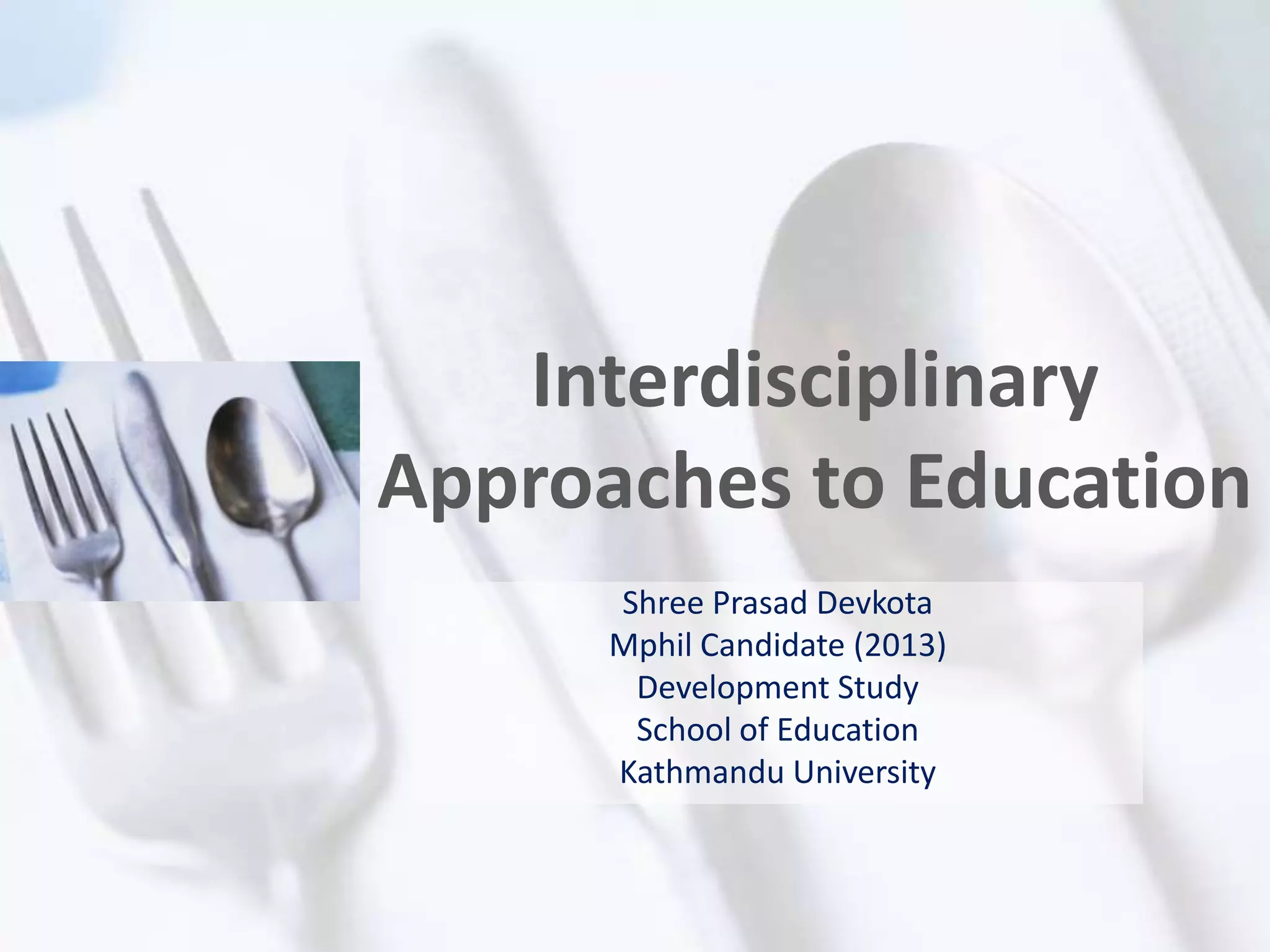 This document discusses interdisciplinary approaches to education. It begins by defining related terminology such as interdisciplinary, multi-disciplinary, and disciplinary. It then discusses how interdisciplinary approaches integrate knowledge from multiple fields to provide a more comprehensive understanding of complex issues that cannot be addressed by single disciplines alone. The document provides examples of interdisciplinary curricula in Nepal and at Kathmandu University. It also outlines the strengths of interdisciplinary learning in developing structural knowledge and making connections. While interdisciplinary approaches provide benefits, they also face challenges integrating fields and dealing with issues like territorial conflicts.