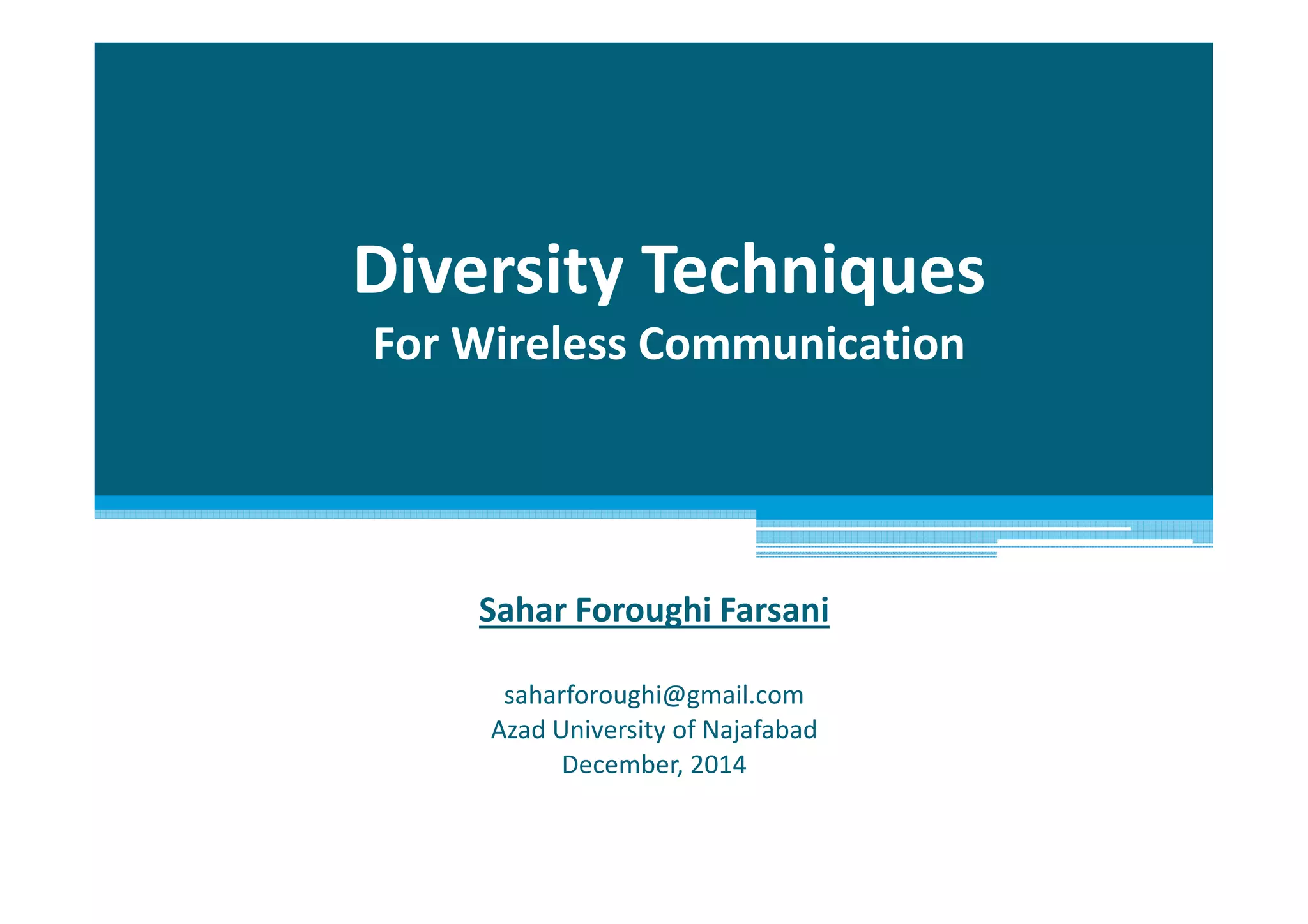 This document discusses diversity techniques for wireless communication, including cooperative diversity. It begins by introducing wireless systems and the impairments they face like fading. It then covers various diversity techniques like space, frequency, and time diversity that provide multiple transmission paths to reduce fading. Cooperative diversity is described as allowing single-antenna devices to achieve MIMO-like benefits by sharing antennas. The document outlines cooperative transmission protocols and challenges at different network layers in implementing cooperation. In conclusion, diversity techniques improve performance by providing multiple signal replicas to overcome fading, while cooperation enables reliability and throughput gains with challenges to address across protocol layers.