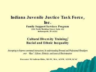 This document provides an overview of a cultural diversity training presentation on racial and ethnic inequality. The presentation discusses how race is a social construct rather than biological reality, how racial categories have been used to justify domination, and the concepts of culture, ethnicity, minorities, prejudice, discrimination, and their role in perpetuating inequality. It also examines historical understandings of race, current issues around immigration and racism, and theoretical perspectives for analyzing racial and ethnic inequality.