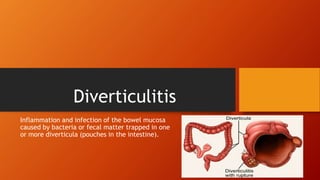 Diverticulitis is an inflammation and infection of the bowel caused by bacteria or fecal matter trapped in pouches in the intestine called diverticula. It is more common in older adults, males, and those with low-fiber diets and constipation. Symptoms include abdominal pain in the lower left quadrant radiating to the back along with nausea, vomiting, fever, and chills. Diagnosis involves blood tests, stool samples, imaging like CT scans, and colonoscopy. Treatment ranges from antibiotics and diet changes for uncomplicated cases to IV antibiotics, fluids, and possibly surgery for perforated or abscessed areas. Complications can include bowel perforation, bleeding, infection, and obstruction if not properly treated