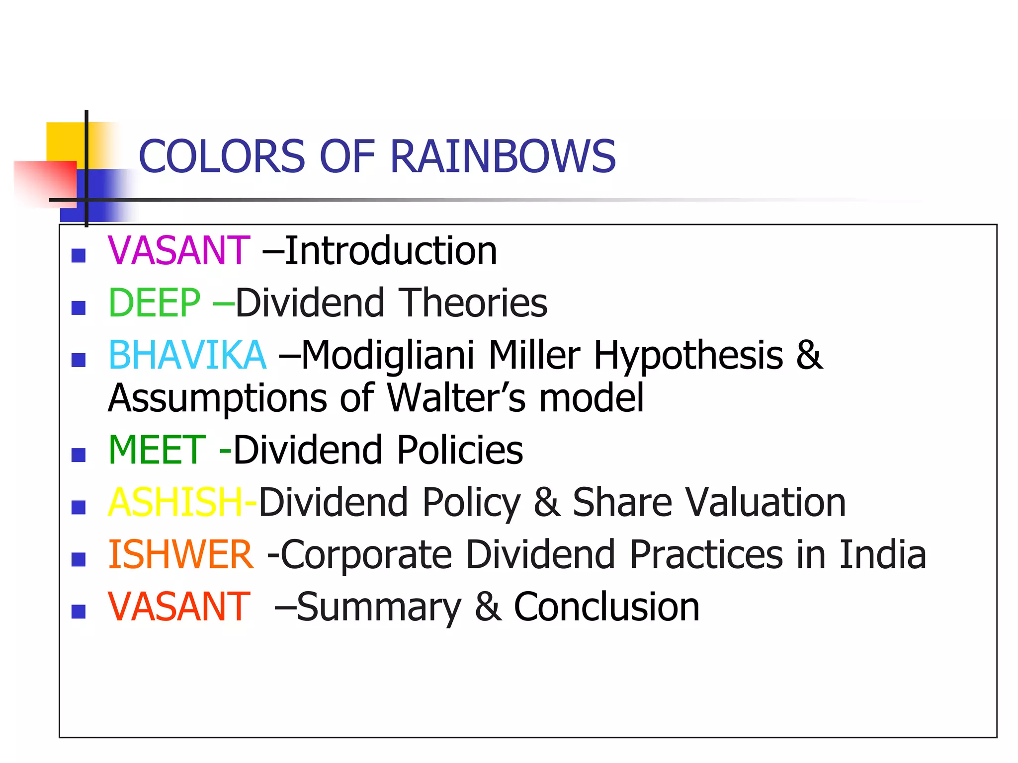 This document discusses various aspects of corporate dividend policies, including theories on dividend relevance and irrelevance, factors that influence dividend policies, types of dividends such as stock dividends and stock splits, and methods of stock repurchase. It covers Modigliani-Miller's argument that dividends are irrelevant, counterarguments that dividends do matter due to taxes and signaling, and factors corporations consider in determining their dividend policies such as funding needs, liquidity, and debt restrictions.