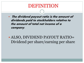 The dividend payout ratio measures the percentage of a company's net earnings that are paid out in dividends. It is calculated by dividing the total dividend amount by the net income. A lower payout ratio indicates that more earnings are being retained for reinvestment, while a higher ratio means more earnings are being distributed to shareholders. The payout ratio is important for investors to consider because it provides information about how much cash a company is willing to pay out versus reinvesting for future growth.