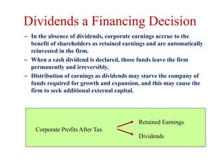 This document discusses dividend theory and policy. It explains that in the absence of dividends, corporate earnings accrue to shareholders as retained earnings that are automatically reinvested in the firm. However, when dividends are declared, those funds leave the firm permanently. The document then outlines several factors that determine a firm's dividend policy, including dividend payout ratio, stability of dividends, legal restrictions, and owners' considerations. It provides examples and explanations of different types of dividend payments, including cash dividends, stock dividends, stock splits, and share repurchases.