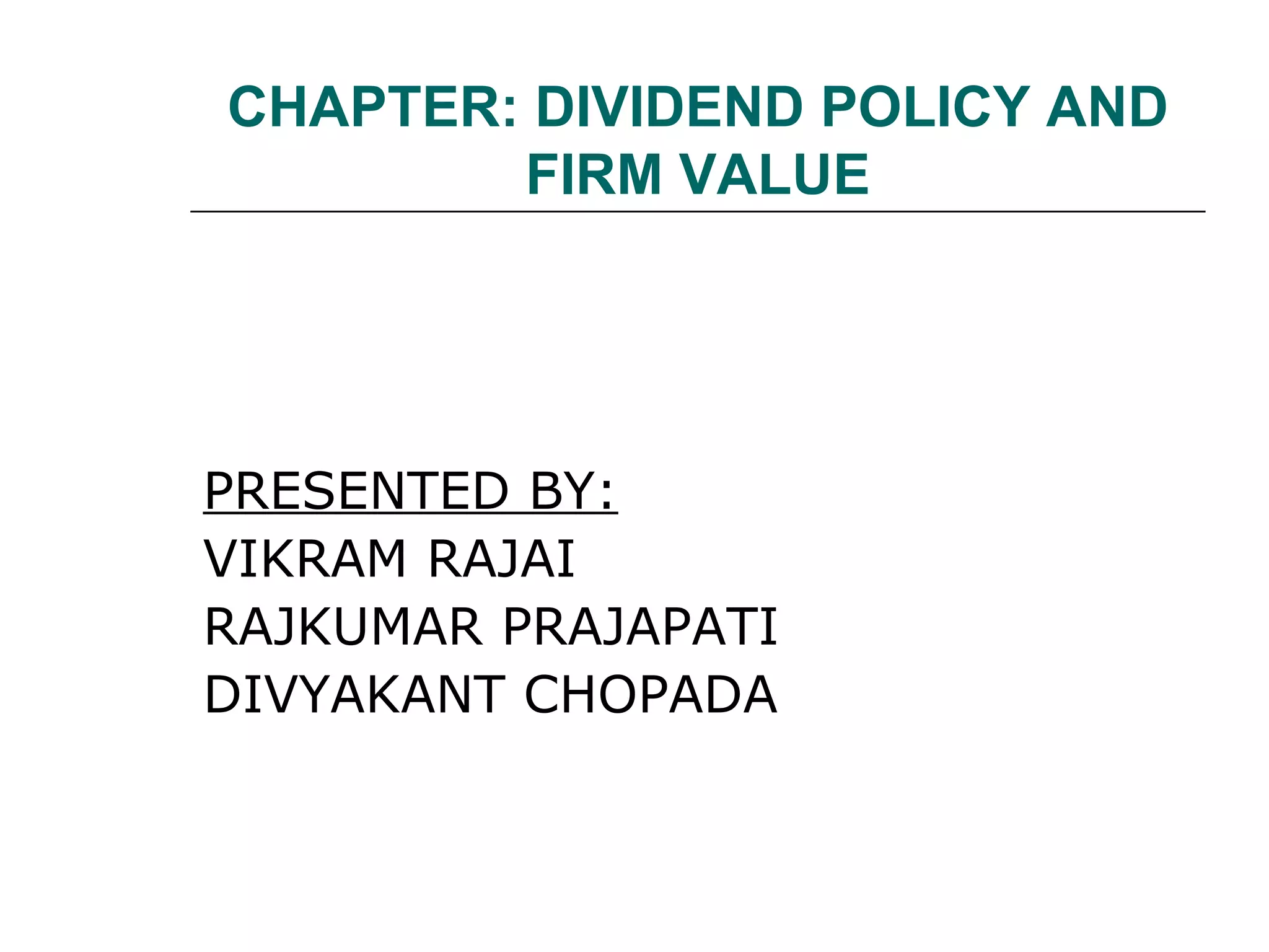 This document discusses dividend policy and its impact on firm value. It covers 5 sections: 1) Models relating investment and dividend decisions, including the Walter and Gordon models. 2) The traditional view that the market values dividends more than retained earnings. 3) The Miller-Modigliani position that dividend policy does not impact value under certain assumptions. 4) The radical view that dividends should be minimized due to tax advantages of capital gains. 5) An overall picture of two broad schools of thought on the relationship between dividends and share value.