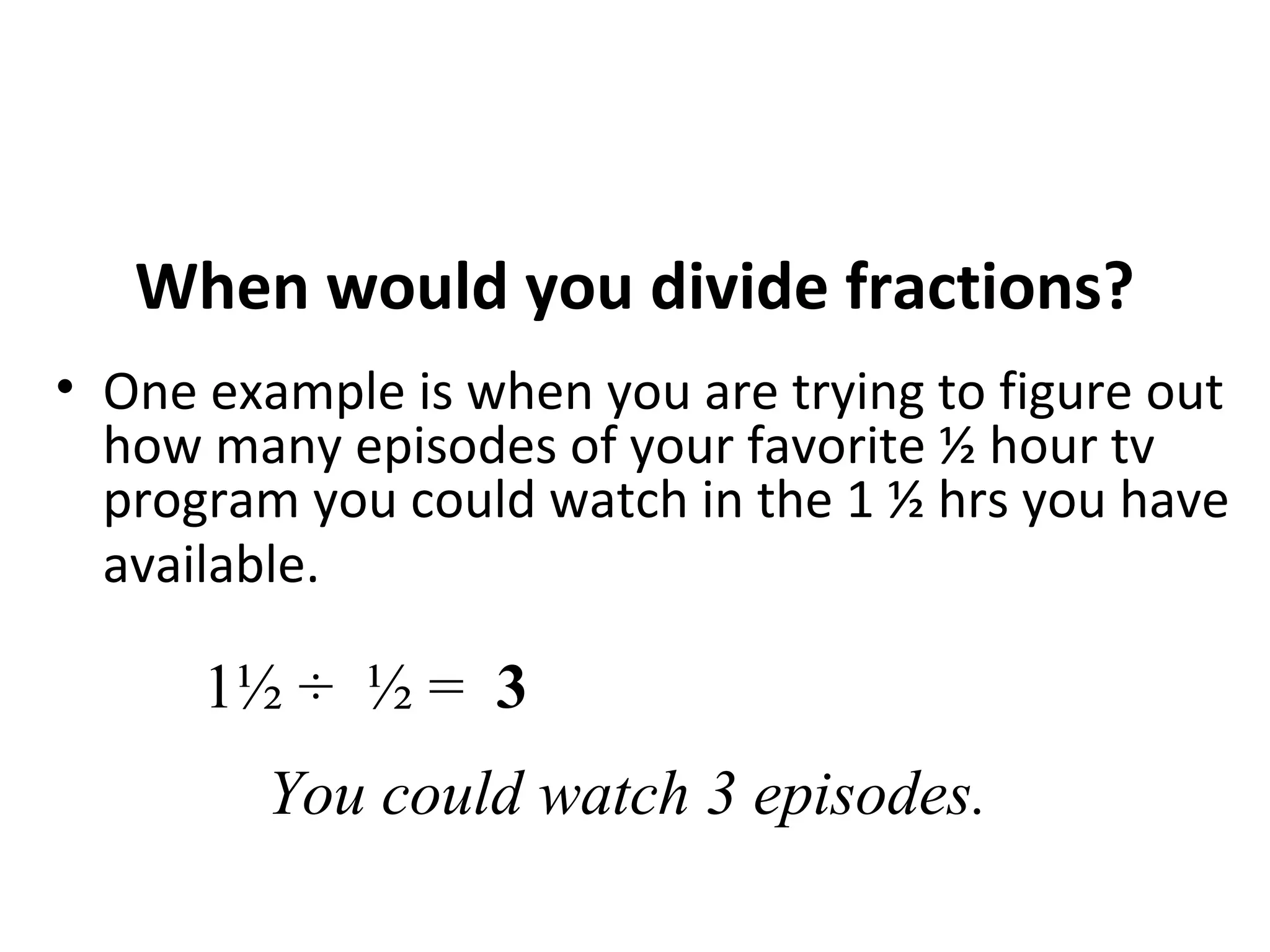 This document provides instructions for dividing fractions. It begins by giving examples of dividing whole numbers and fractions. It explains that when dividing fractions between 0 and 1, the quotient will be larger than at least one of the fractions. The steps for dividing fractions are then outlined: 1) convert fractions to improper form, 2) keep the first fraction, 3) change the operation to multiplication, 4) take the reciprocal of the second fraction, 5) multiply the numerators and denominators, and 6) simplify if possible. Several examples are worked through to demonstrate the process.