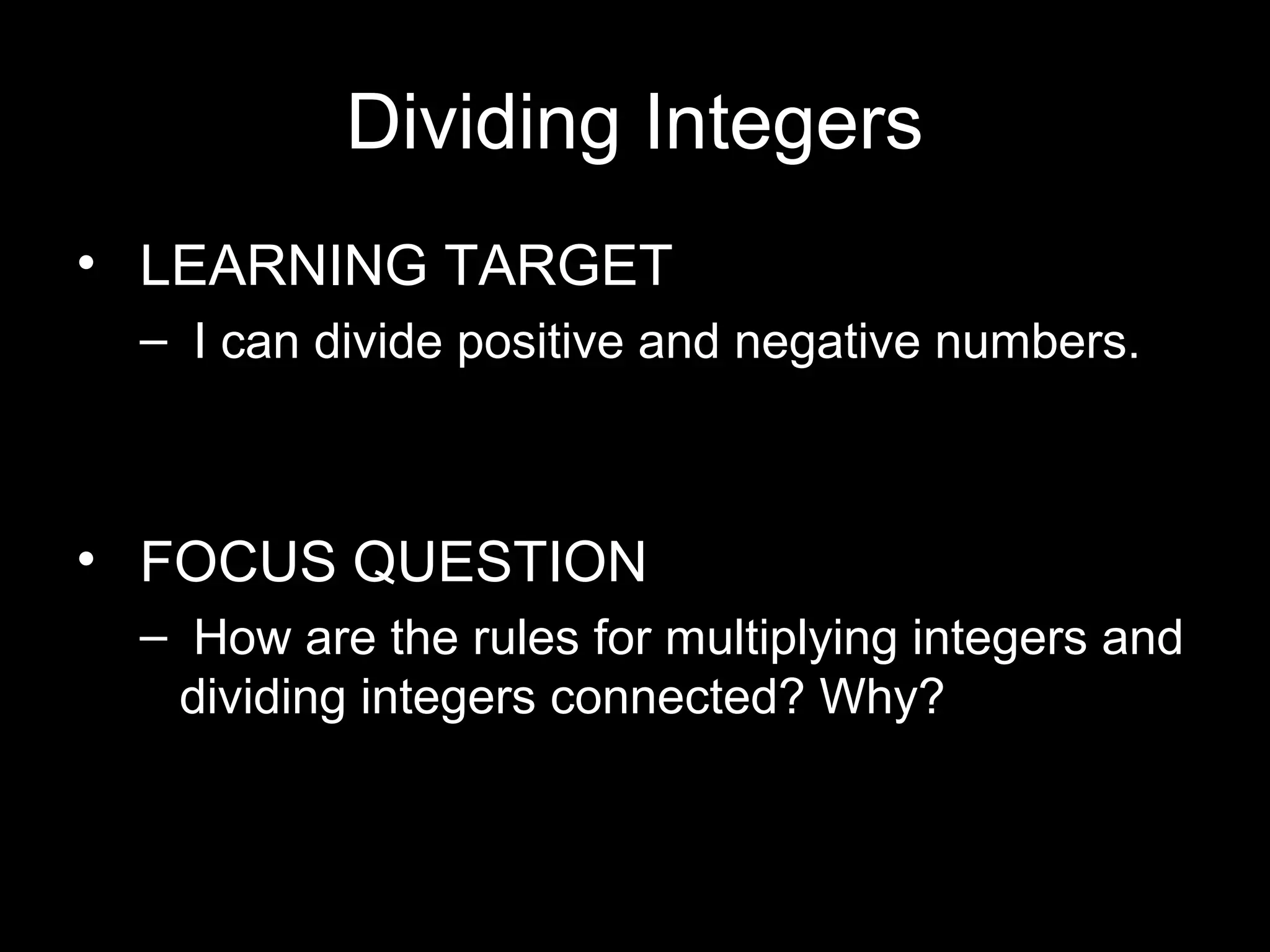 The document discusses dividing integers and their rules: