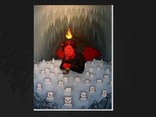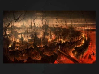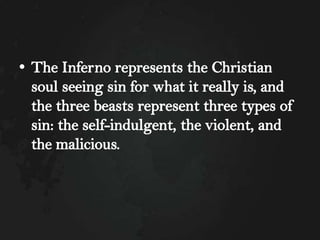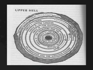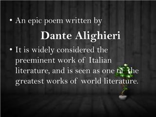 The Divine Comedy is Dante Alighieri's epic poem that narrates his journey through Hell, Purgatory, and Heaven. It is guided through these realms by the Roman poet Virgil and his beloved Beatrice. The poem uses these journeys as a means to instruct about sin and virtue. Hell is depicted as nine circles based on types of sin with brutal punishments. Purgatory is depicted as a mountain with seven terraces to purge oneself of the seven deadly sins. Heaven is depicted as concentric spheres where the soul ascends closer to God based on virtue.