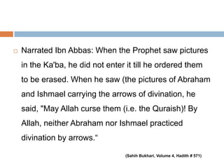 Divination by Arrows was a practice of the Quraish tribe in Mecca where they would use arrows to make important decisions. When the Prophet Muhammad saw pictures depicting Abraham and Ishmael engaging in this practice in the Kaaba, he ordered the pictures erased and stated that neither Abraham nor Ishmael actually practiced divination by arrows.