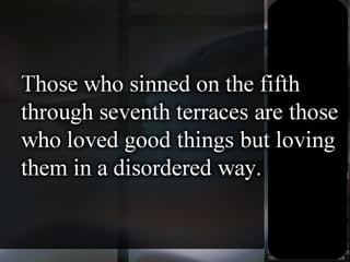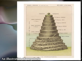 The document summarizes Dante's Divine Comedy, an epic poem describing his journey through hell (Inferno), purgatory (Purgatorio), and heaven (Paradiso). It is composed of three canticles, or sections, with Inferno depicting nine circles of the damned based on their sins. Purgatorio describes seven terraces where souls purge themselves of sins like pride, envy, and lust before reaching paradise. The poem is considered one of the greatest works of Christian literature.