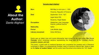 The document provides an overview of Dante Alighieri's epic poem Divine Comedy. It discusses the poem's structure, which is divided into three sections - Inferno, Purgatorio, and Paradiso - representing Hell, Purgatory, and Heaven. It also summarizes the content of each section, with Inferno depicting Dante's journey through the nine circles of Hell, guided by the Roman poet Virgil. The circles are organized by the types of sins punished in each, such as lust, gluttony, heresy, and violence.