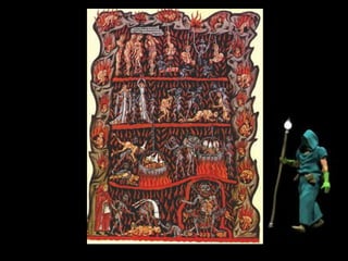 Dante's Divine Comedy describes his journey through Hell, Purgatory, and Heaven. In Hell, sinners are organized into concentric circles based on their sins and receive specific punishments. Purgatory involves purification and climbing its terraces to erase the seven deadly sins. In Heaven, Dante is guided by Beatrice through the nine celestial spheres, finally glimpsing God at the top. The poem had a profound influence on literature and examines the poetic interpretation of the afterlife.