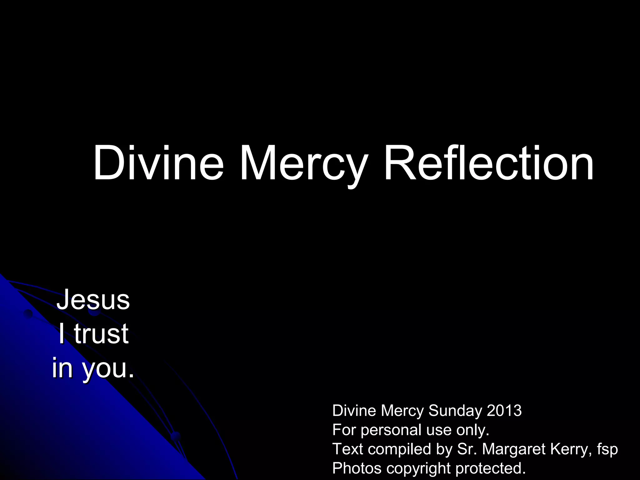 This document is a Divine Mercy reflection prepared by Sr. Margaret Kerry for personal use only on Divine Mercy Sunday 2013. It contains the repeated phrase "Jesus I trust in you" along with notes that the text was compiled by Sr. Kerry and contains original content with some quotations, and that photos may be copyright protected. The summary focuses on the purpose and attribution of the document.
